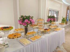 Mỗi gói đã bao gồm đầy đủ: bánh mặn – bánh ngọt – trái cây – nước uống – ly, khăn, set up bàn tiệc.